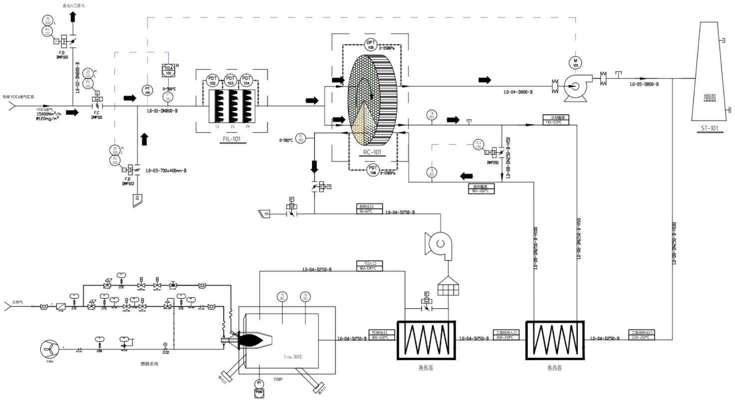 本文所提及的廢氣為含硅廢氣,由于有機硅在高溫的條件下容易與氧氣反應形成二氧化硅結晶體,這種結晶體容易堵塞催化劑表面微孔,致使催化劑物理失活;同時這種結晶體也能堵塞陶瓷蓄熱體的廢氣孔道,一方面影響廢氣的通過效率,同時又降低了陶瓷蓄熱體的換熱效率,所以上述含硅廢氣的處理,既不適用催化氧化法,也不適用蓄熱焚燒法,這樣一來TO直燃爐成為適用的處理工藝。