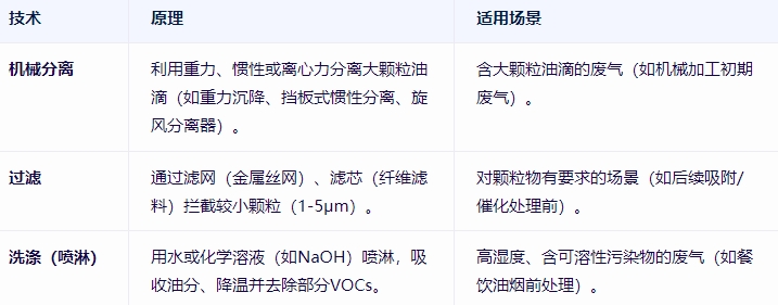 預(yù)處理旨在去除大顆粒油滴、水分、粉塵等,避免干擾后續(xù)核心處理設(shè)備(如堵塞吸附劑、腐蝕催化劑)。