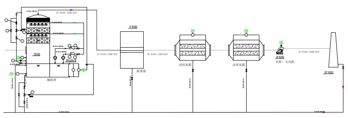 洗滌塔采用立式兩相逆向流填料塔。氣體從塔體下方進氣口沿切向進入凈化塔,在通風機的動力作用下,迅速充滿進氣段空間,然后均勻地通過均流段上升到填料吸收段。在填料的表面上,氣相中污染物被液相吸收。污染物隨吸收液流入下部貯液槽。未完全吸收的氣體繼續上升進入噴淋段。在噴淋段中吸收液從均布的噴嘴高速噴出,形成無數細小霧滴與氣體充分混合、接觸、繼續發生吸收作用。塔體的上部是除霧段,氣體中所夾帶的吸收液霧滴在這里被清除下來,經過處理后的潔凈空氣從凈化塔上端管道進入下一處理流程。