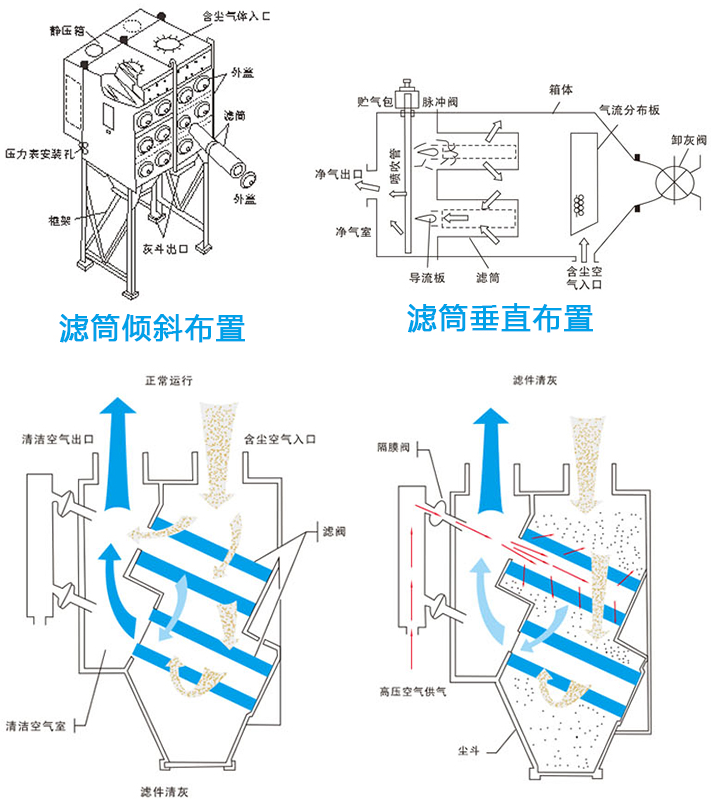 濾筒除塵器主要是由進風管、灰斗、箱體、清灰裝置、導流裝置、濾筒、氣流分布板及電控裝置組成的。下部是過濾室,上部是氣箱脈沖室。在濾筒除塵器入口的位置裝有氣流分布板。濾筒可以垂直布置在箱體花板上,也可以傾斜的布置在花板上。從清灰的效果上看,垂直方向的布置得比較適當。鑫藍環保的濾筒除塵器被普遍地應用在鋼鐵、食品、冶金、化工、打磨等工業區域中。